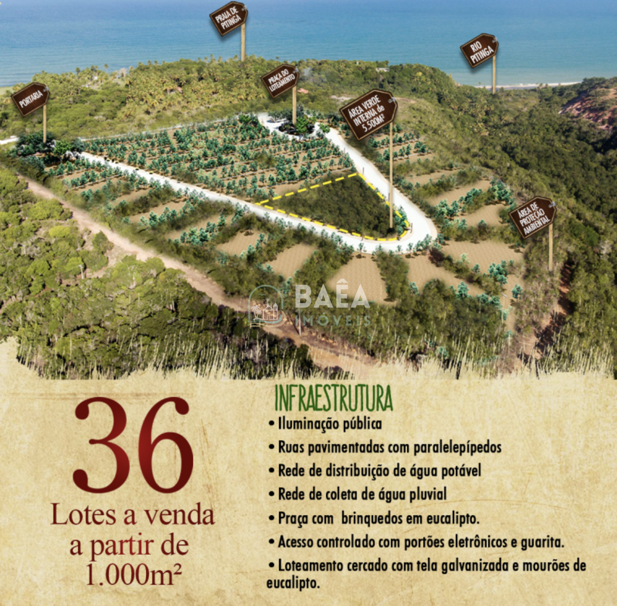 O loteamento Alto de Pitinga é a escolha perfeita para quem busca viver ou investir com vista deslumbrante e qualidade de vida em Arraial d’Ajuda. Com apenas 36 lotes a partir de 1.000 m², oferece opções com vista mar, vista para a mata ou vista interna, todos com água potável em lote individual, acesso controlado e segurança total.