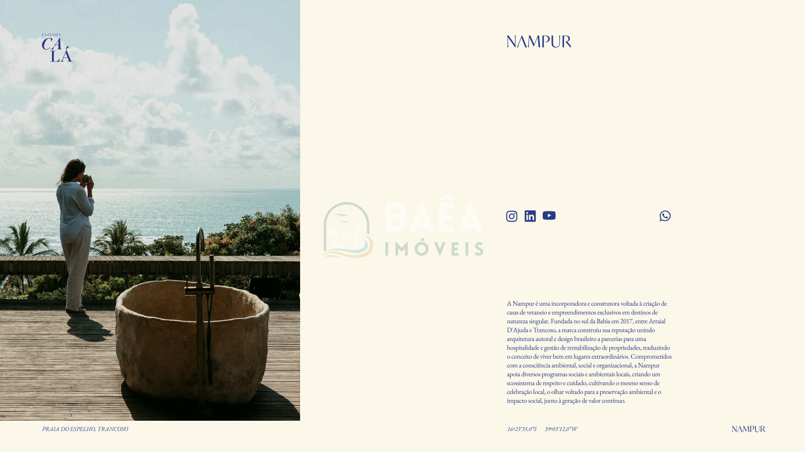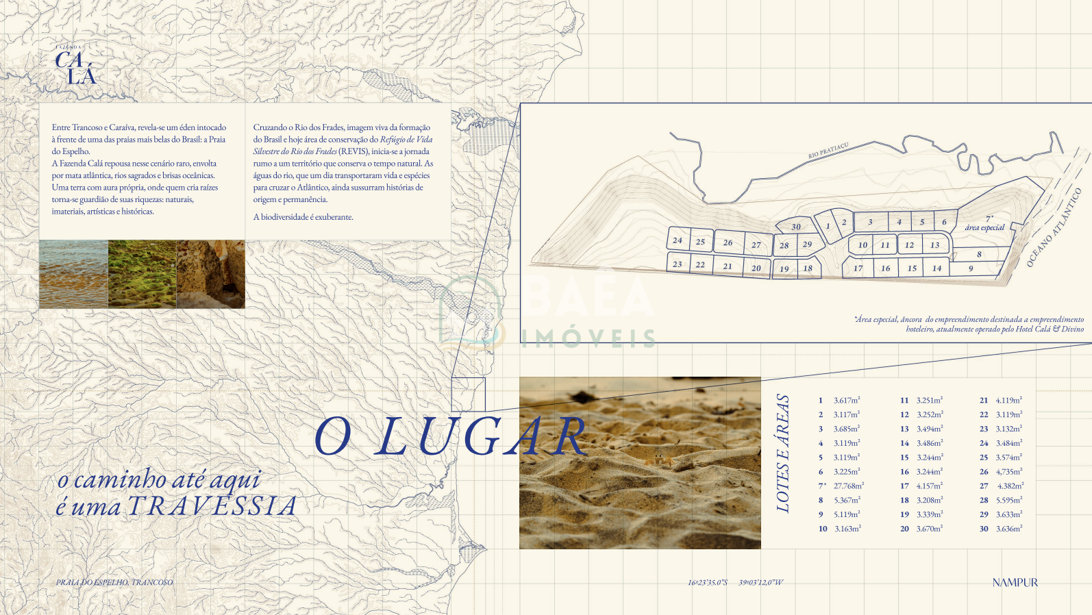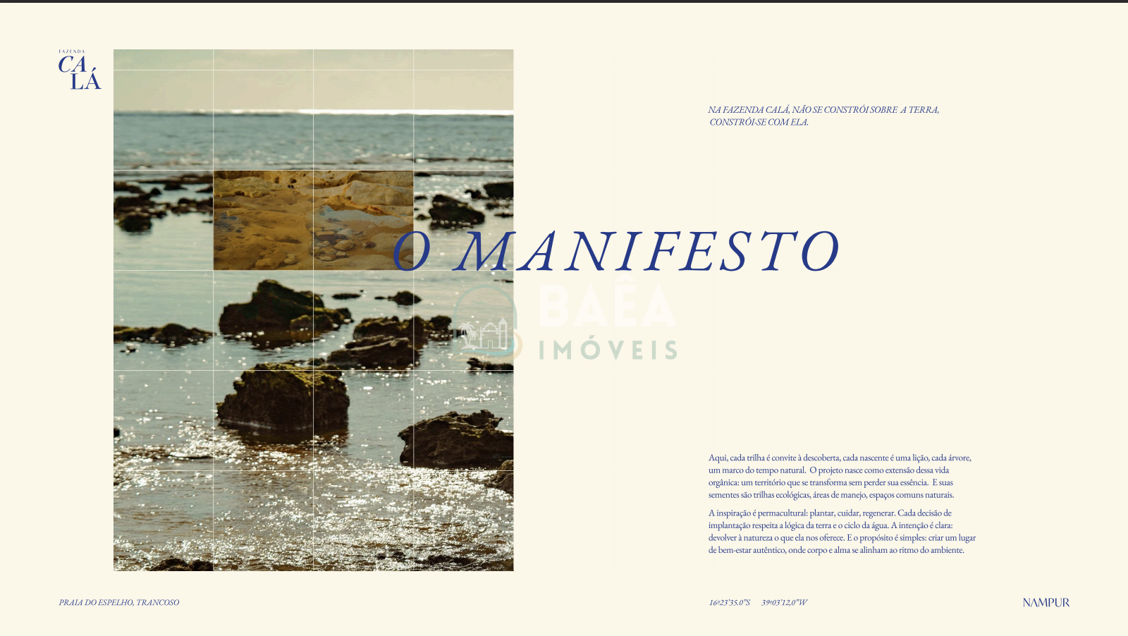 Fazenda Calá é um empreendimento absolutamente singular na Praia do Espelho, entre Trancoso e Caraíva, desenhado para quem busca mais do que um imóvel: busca um novo jeito de viver. Em um cenário de mata atlântica preservada, rios sagrados e mar de águas cristalinas, o projeto une arte, natureza e propósito em um conceito de luxo discreto, onde o verdadeiro privilégio é o silêncio, o tempo e a relação profunda com a terra.